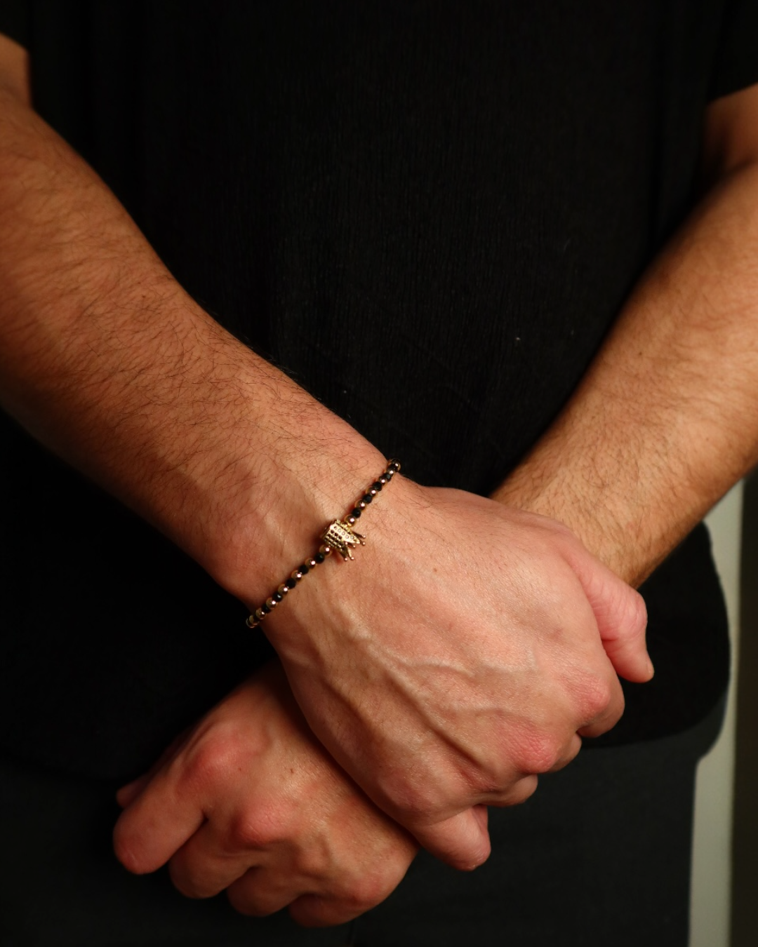Brățara Regal este un accesoriu elegant, inspirat de simbolul puterii și al rafinamentului – coroana. Designul său combină armonios pietrele negre cu bilele aurii, iar elementul central în formă de coroană oferă un aspect impunător și sofisticat.