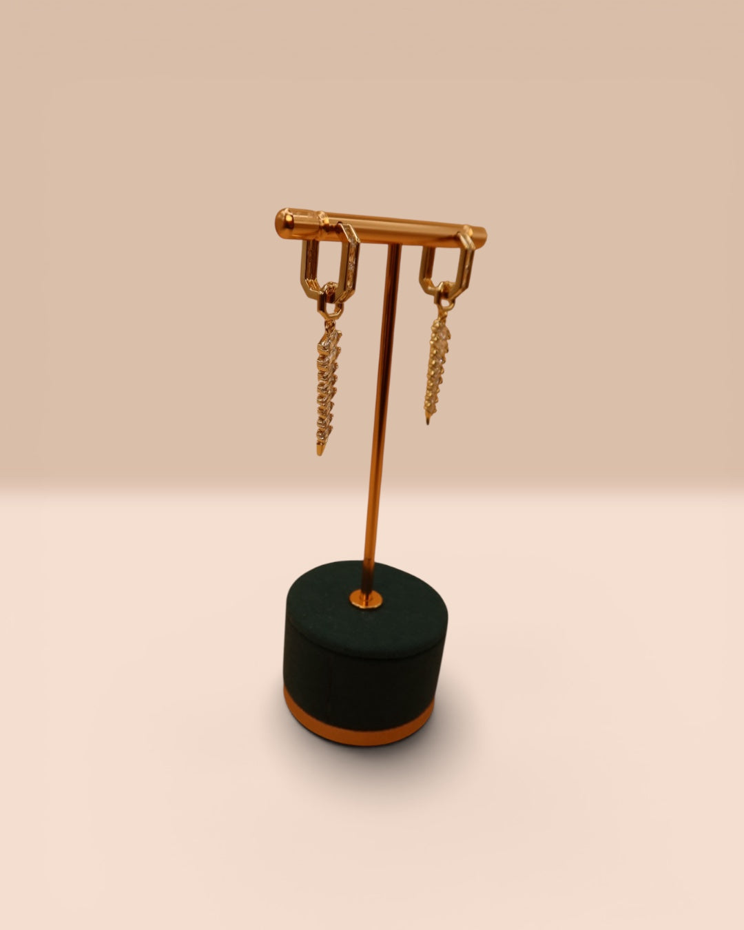 Placați cu aur de 18K, acești cercei au un finisaj elegant și o strălucire deosebită, fiind perfecți atât pentru ținutele de zi, cât și pentru ocazii speciale. Forma lor alungită adaugă un plus de stil și feminitate, completând perfect orice look sofisticat.
