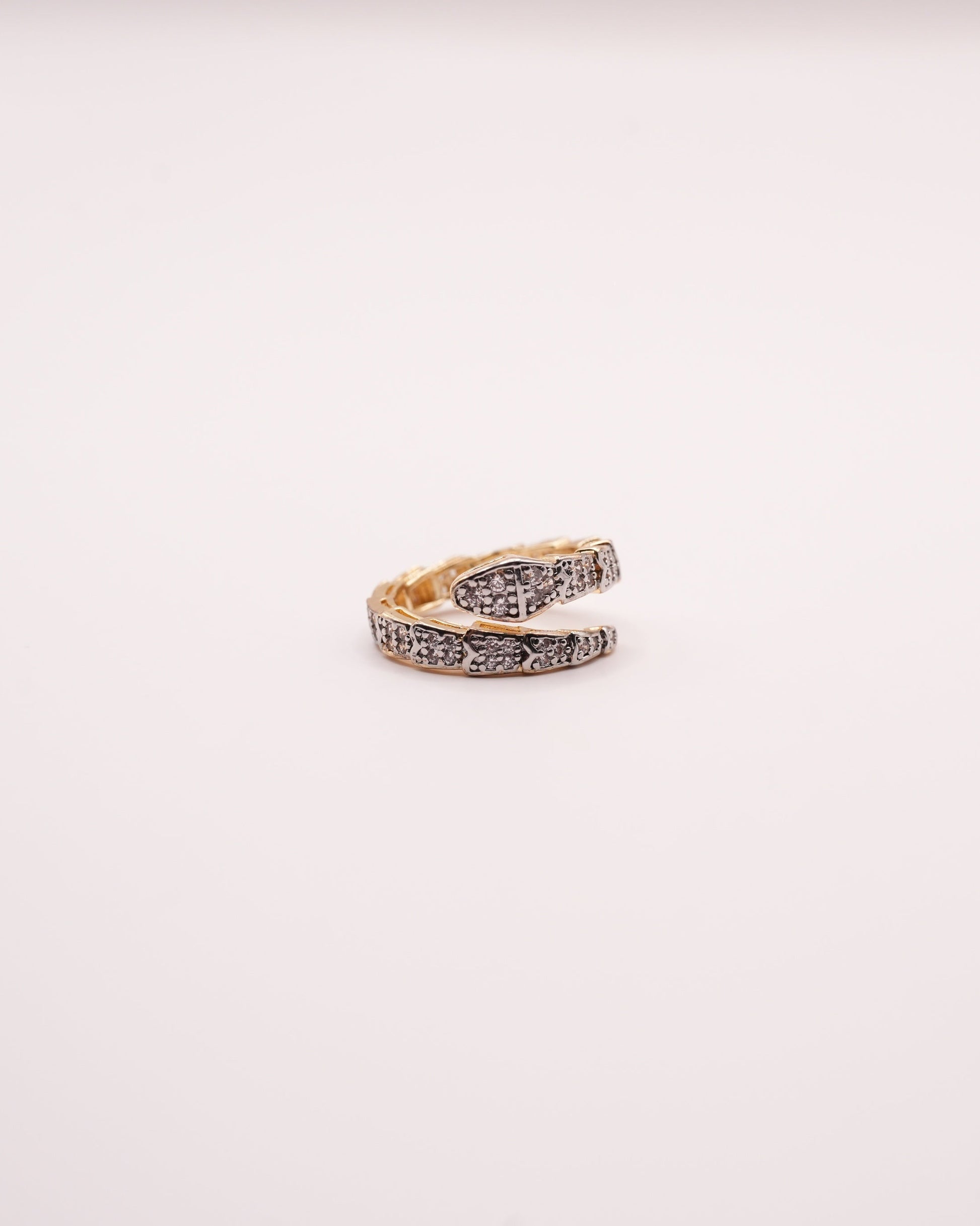 Realizat din oțel inoxidabil placat cu aur, inelul Serpa impresionează prin designul său stilizat, cu linii fluide ce urmăresc forma șarpelui, decorate cu cristale fine ce oferă o strălucire subtilă. Designul deschis asigură confort și ajustabilitate, fiind ideal pentru purtare zilnică sau ocazii speciale.