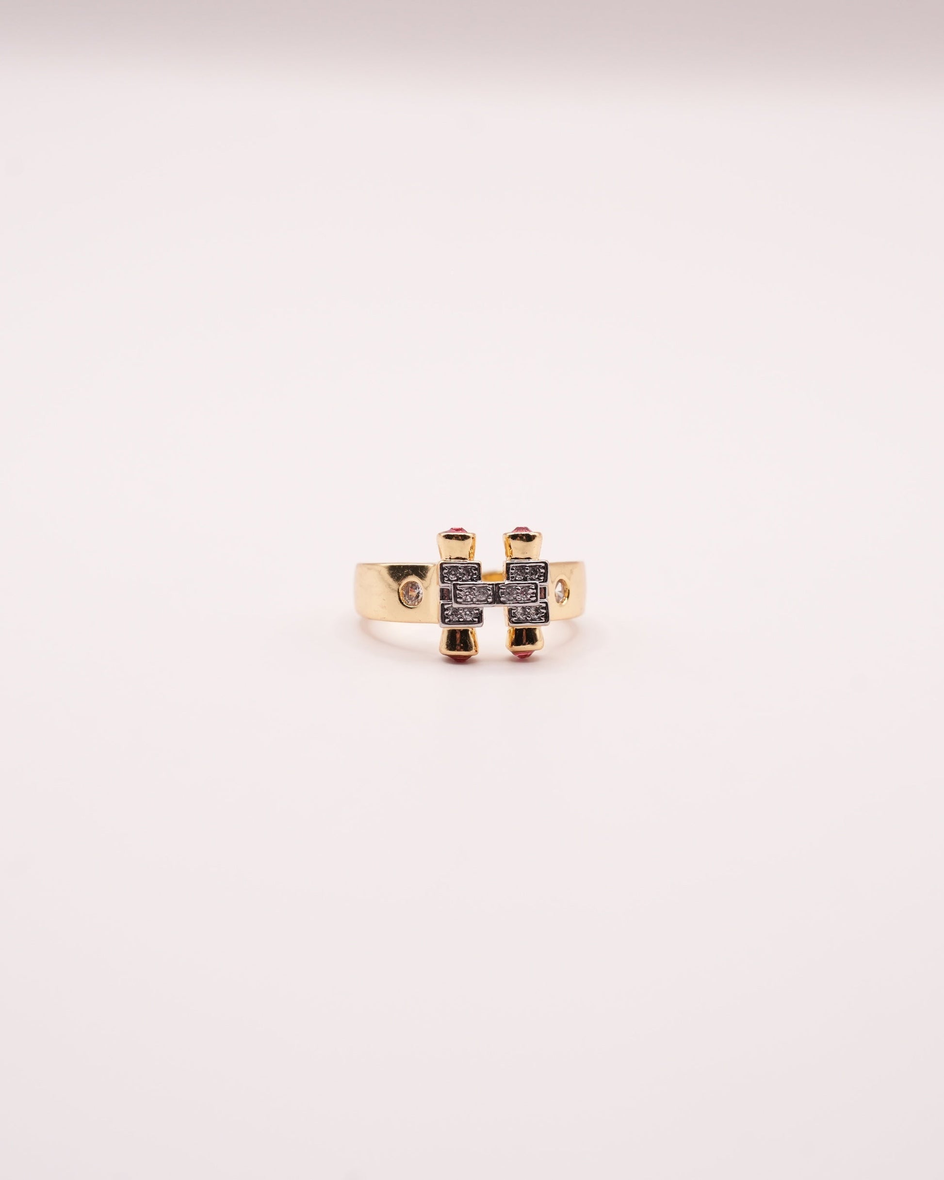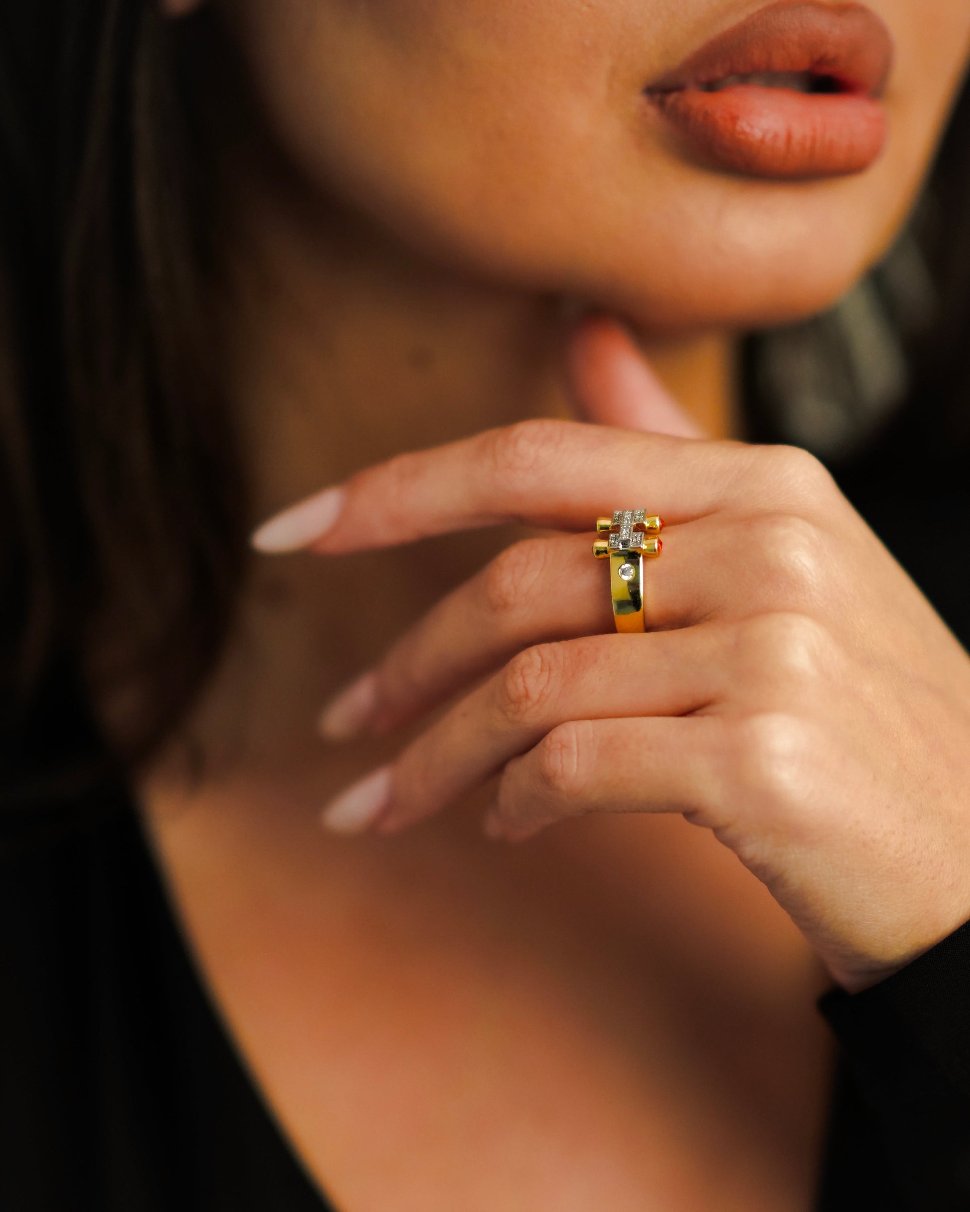 Realizat din oțel inoxidabil placat cu aur, inelul Nexus se remarcă prin elementul central stilizat, decorat cu cristale fine, care adaugă un plus de strălucire și rafinament. Liniile clare și forma arhitecturală oferă un aer modern și sofisticat, transformând această bijuterie într-un accesoriu cu personalitate.