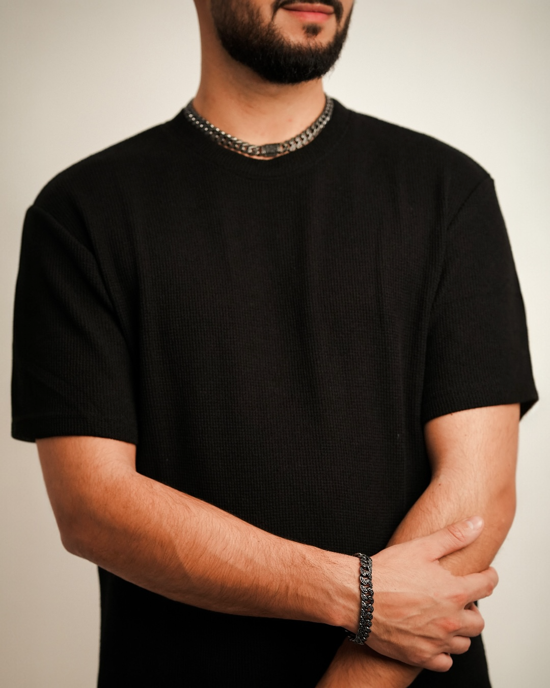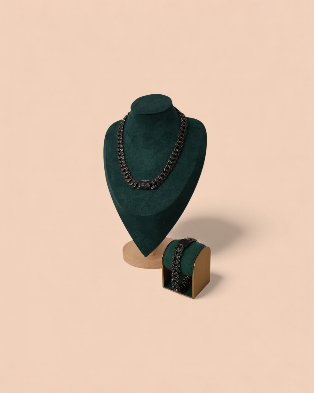 Setul Cuban Black Crystal este un accesoriu statement cu un design impunător, creat pentru cei care preferă bijuteriile masive și sofisticate. Lanțul clasic cuban, pus în valoare de cristale negre încastrate cu atenție, oferă un aspect modern, elegant și plin de personalitate.